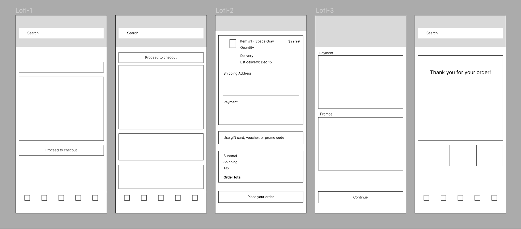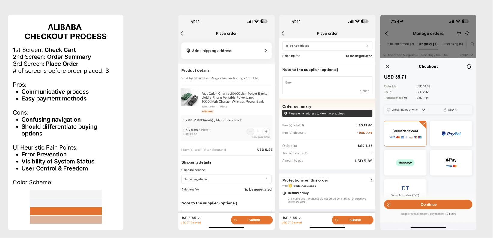 Each competitor's checkout process designs are displayed to fully distinguish their main similarities and differences.
