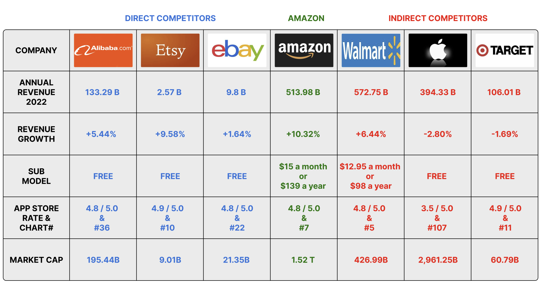 Below are Amazons top 3 direct and top 3 indirect competitors, comparing how they value in the market in regard to Amazon.
