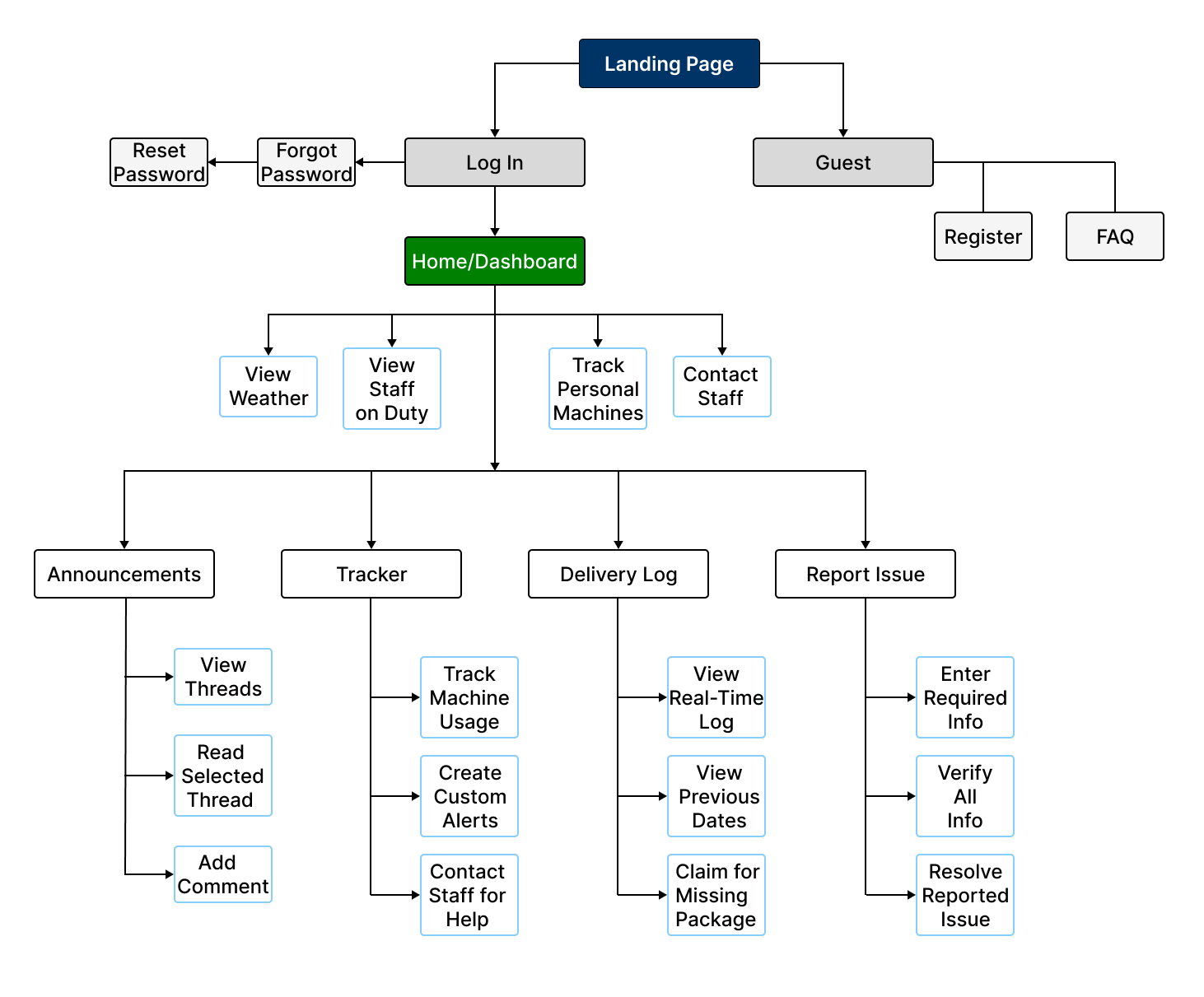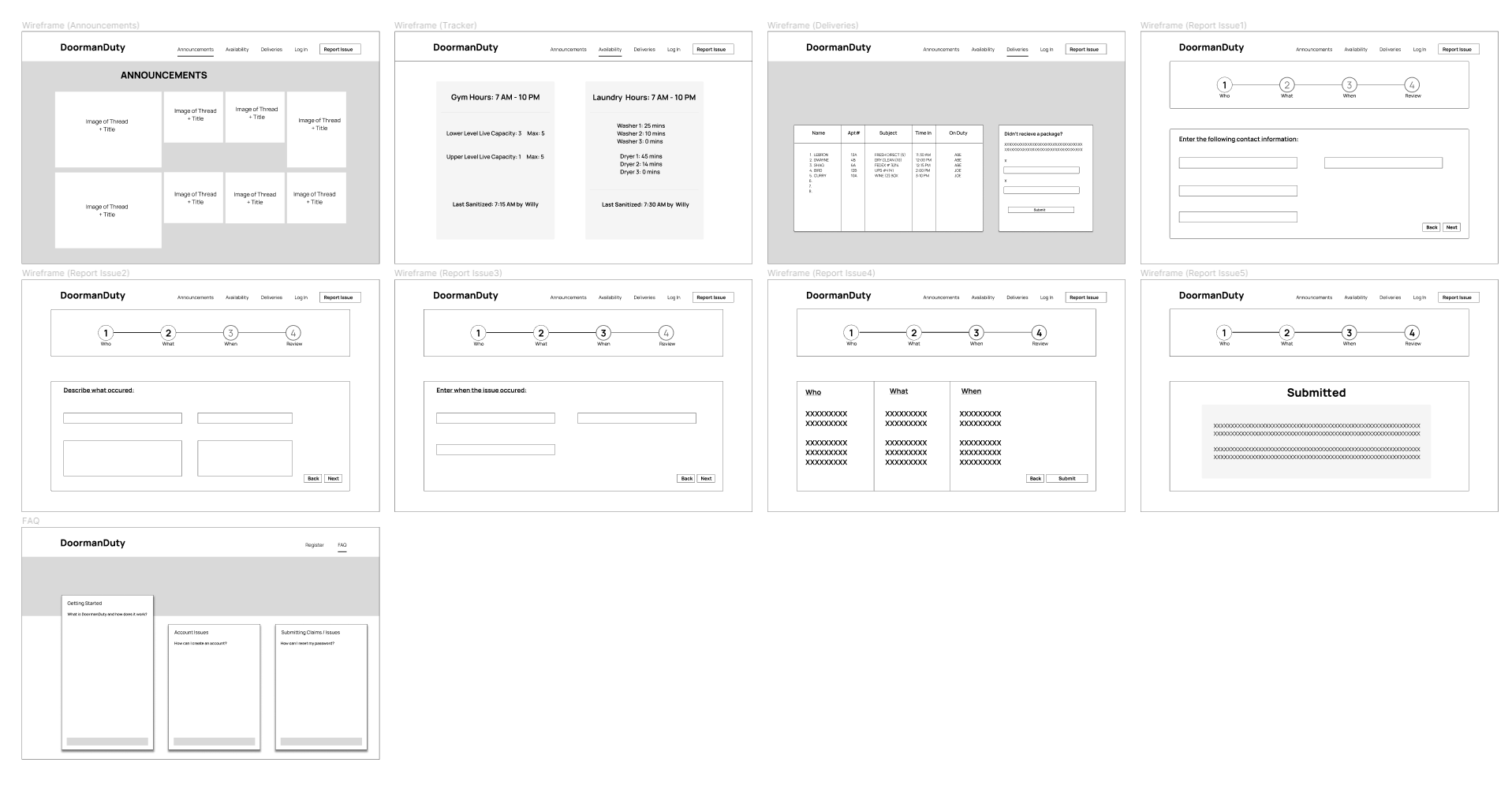 Using feedback and iterations, I created the high-fidelity wireframes. I looked over the low fidelity frames repeatedly and made some changes. These pages mainly consist of boxes of information, which I thought would help users identify what they are looking for. The main difference from the low fidelity wireframes are the three main task pages: announcements, tracker, and deliveries. I incorporated interactive buttons that will help the user navigate around each page.