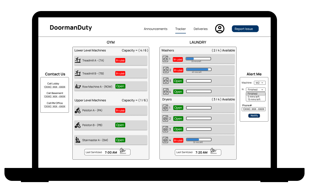 Abe becomes frustrated due to his lack of appreciation and develops DoormanDuty hoping to solve and further prevent issues dealing with miscommunication. Now that we can include DoormanDuty into the picture, Abe can solely focus on urgent tasks in the lobby. By incorporating the web app, this upset shareholder can now view the gym capacity at their own convenience. With this said, they can appropriately schedule with personal trainers not having to deal with unanswered phone calls. This shareholder is also very picky with what machines he uses. The gym machine tracker allows the shareholder to view availability instead of waiting in the gym until someone is done. Overall, shareholders find the app useful with scheduling and building organization. Abe can now limit miscommunication with the shareholders and improve his attention for lobby security and demanding requests.