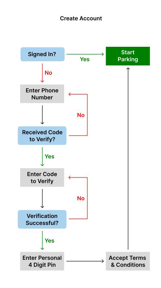 Potential Solution: The best way to improve the account settings tasks is by changing the verification method. Instead of asking for a phone number, email address, and password, I will incorporate only a phone number verification. Users will input their number and a pin will be sent to their phone which they will have to input into the app to complete verification. Once they verify, they can start parking sessions and overall will save time and prevent issues when creating an account. The user will remain online unless they personally log off. Once they log off, they must verify their phone number again to enable them to access the app.