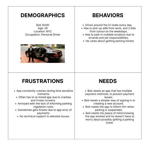 Using the reviews from the app store and additional research findings I created a User Persona. This is all based off users who most likely would use the app multiple times a day in different locations. The User Persona describes the users' active behaviors, frustrations, and needs from the ParkNYC app.